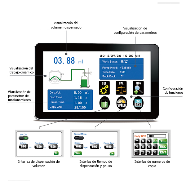 Además, es posible programar el volumen de dosificación, el tiempo de pausa y el número de copias necesario en cada una de las bombas.